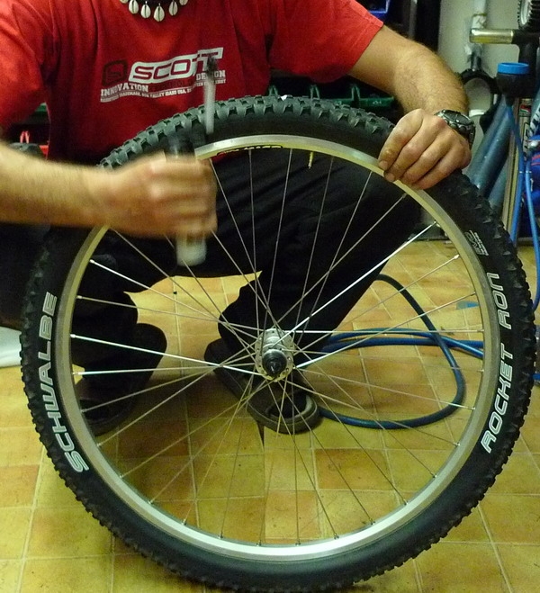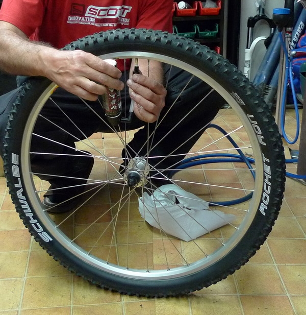 Druhým přípravkem, který jsme prubli na opravu defektu je pěna ve spreji od značky Zefal. Lahvička obsahuje 100ml přírodního latexu, která prý nafoukne pneu do 20 sekund na 2,5 baru. Vzali jsme tedy kolo s pneu duší a udělali jsme špendlíkem defekt. Nechali jsme duši ujít, aby se na kole nedalo jet. Pak jsme vzali Zefal pěnu a opět před použitím řádně protřepali. Zefal má na rozdíl od Pit Stopu Geax hadičku, která má na svém konci šroubovací spojku, jenž se připevní na ventilek. Pozor při aplikaci musíte mít lahvičku dnem vzhůru. Pro přemístění pěny do duše je třeba vyvinout poměrně velkou sílu oproti aplikaci Pit Stopu Geax. Zefal pěna rychle nahustí pneu a zacelí píchnutou duši. V místě bodnutí se nám opět objeví kaučuková pěna. Kolem po dokončení aplikace zatočíme. Kolo jsme zkontrolovali po deseti minutách a tlak stejný jako při aplikaci pěny, takže vřele doporučuji.