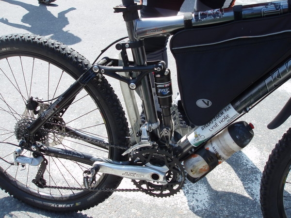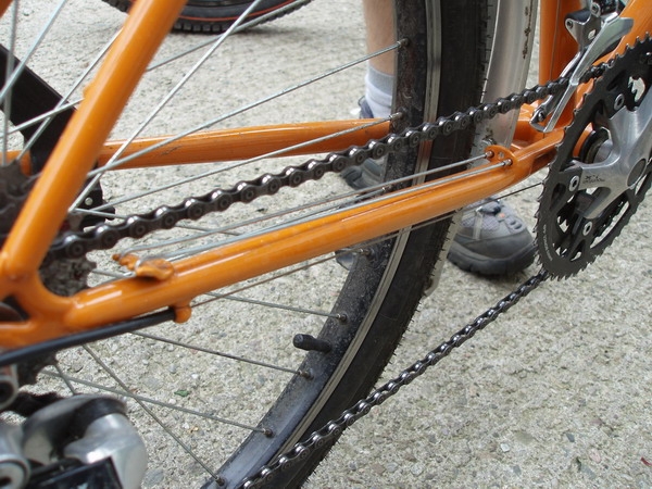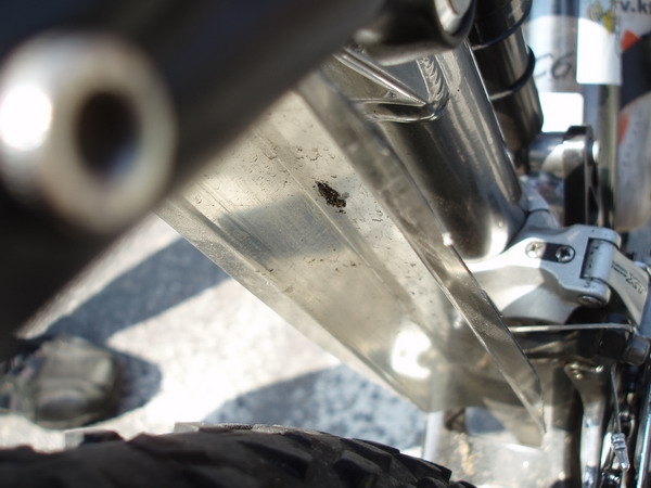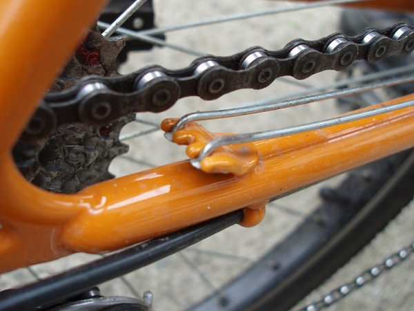 Občas mi pod ruce na servis přijdou opravdu zajímavé kousky a či technické kuriozitky. Jednou z nich byl před nedávnem zajímavej rám, ještě se zajímavějším řešením chrániče zadní stavby před tlučícím řetězem. Žádnej neoprén ani či kus starého pláště, ale náhradní dráty do výpletu chrání zadní vidlici. Velice vtipné a levné řešení, které má navíc tu výhodu, že majitel si sebou vždy veze pro případ prasknutí špice náhradní matroš.