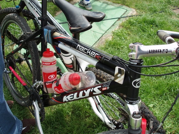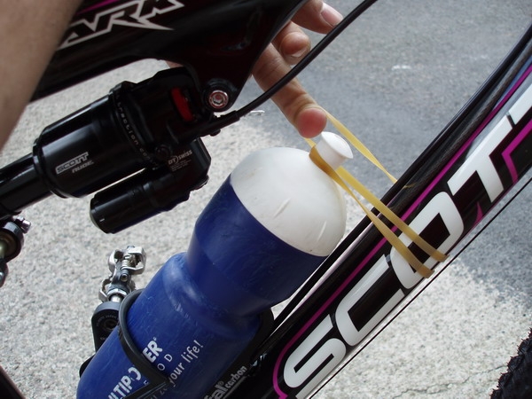 Tato vychytávka se hodí na závody typu Rubena Manitou v Chrudimi,kde hnedle po startu čeká závoďáky sjezd po schodech. Ten každoročně sledují odvážné bajkery špalíry diváků, z nichž si někteří domů odnesou i nějakou tu lahvinku s ionťáčkem. Zde se totiž velice často stává, že díky drncání opustí jezdcův plný bidon košík a ten se poté sám vesele kutálí po schodišti, čímž se rázem stává nebezpečně se pohybující překážkou pro ostatní jezdce. A přitom stačí malá vychytávka, která zajistí, že pitný režim bajkera nebude narušen sjezdem ze schodů. Doporučuji tak na startu použít obyčejnou gumičku, kterou nasadíte na hrdlo bidonu, pak jí obtočíte okolo rámu a z druhé strany opět navléknete na láhev. Pokud máte na kole lanka vedená spodem, je dobré gumičku podvléknout pod nimi, aby nestahovala a nebrzdila lanka. Když potom sjedete schody, stačí gumičku z jedné strany vyvléknout. Napnutá jistící gumička tak okamžitě opustí bajkerovo kolo a jezdec je v pohodě, neb bidon i po schodech zůstal na svém místě.