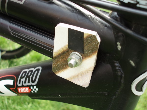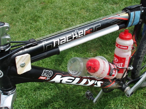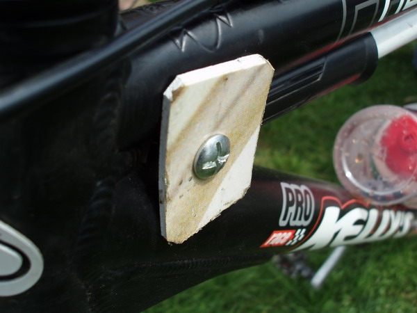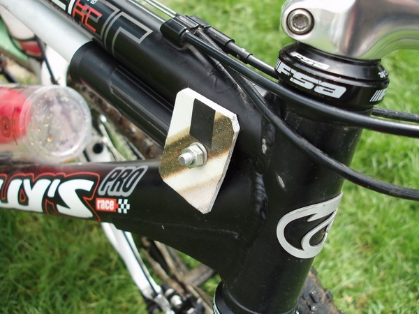 Tento nápad jsem zaregistroval na závodě KPŽ v Brnisku na kole jednoho závoďáka. Ten odmítá vozit sebou pro případ defektu minipumpičky, s kterými nafoukání kola trvá poměrně dlouhou dobu. Lepší nežli malá pumpa je samozřejmě pumpa větší, jenže jak jí připevnit do rámu aby tak spolehlivě držela ? Žádný problém pro šikovné český ručičky tohoto bajkera. Ten totiž použil dva kousky z plastové reklamní tabule, které spojil šroubem skrze proti sobě. Tímto mu vznikl potřebný úchytný bod díky němuž už není problém vložit do rámu dlouhou pumpu.