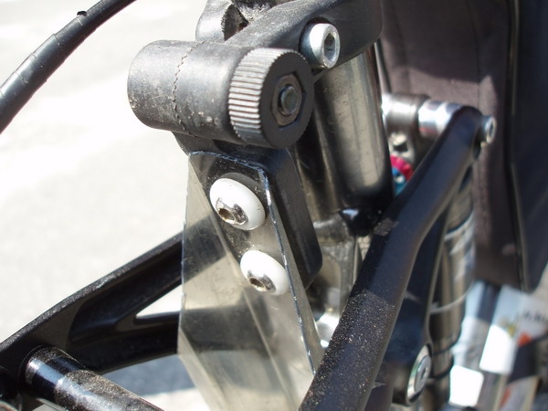 Věčnému boji s blátem vyhlásil válku majitel celopérka KTM. Jelikož se v jeho případě jedná o bajka s čtyř čepovým systémem, nebyl úkol vymyslet blatník zrovínka nejlehčí. Leč opět se potvrzuje, že český bajker vždy řešení najde. Tentokráte blatníček zabraňující útoku bláta na zadní tlumič vznikl pomocí plastové objímky s úchytem. Ta se upevnila na trubku rámu kola. K tomuto úchytu se pak namontoval kus plastu jaký se používá na zastřešení pergol. Čirý plast je dostatečně odolný a dá se snadno opracovávat. Pak už stačilo vyzkoušet, zda-li vše funguje jak má. Blatníček se ani v těch nejdrncavějších sjezdech nehne a stále je na svém místě, kde dokonale plní ochranu před nečistotami.