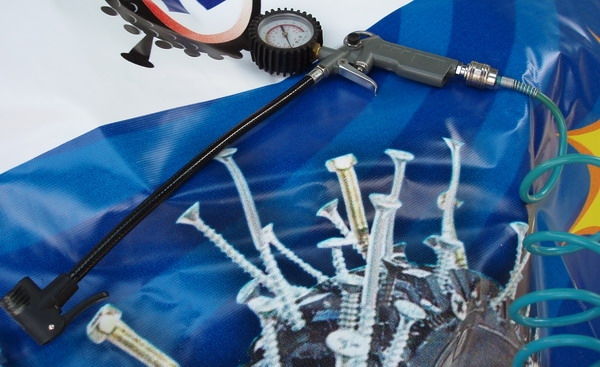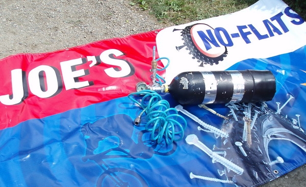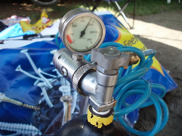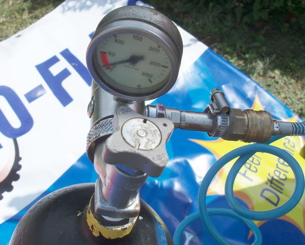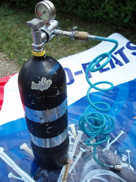 Stále více jsou dneska oblíbené bezdušové pneumatiky, které v kombinaci například s přípravkem No Flats eliminují možnost defektu. Problém je však co když se před startem změní počásko a závodník chce přezout pneu? Ono to totiž bez kompresoru jde velice špatně. Nad tímto problémem se zamysleli pánové z Brniska, co dováží propíchací prevenci No Flats. Nejprve vozili na závody agregát a kompresor, leč tato verze zabírala ve vozidle strašně místa. Pak přišli ,,No Flatsáči" na zajímavý nápad. Ten spočíval ve využití staré potápěčské bomby, na kterou namontovali přepouštěcí ventil a pistoli s manometrem. A výsledek? Touto pětilitrovou bombou bez problému lze nafouknout až dvě stě bezdušových kol, přičemž opětovné naplnění bomby přijde na pouhých padesát kaček. Pořizovací cenovka potápěčské hustilky záleží na typu bomby,ale mělo by to být v rozmezí od 5000 do 8000 Kč.